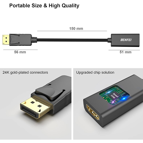 BENFEI DisplayPort Male To HDMI Female Adapter With Gold-Plated Connectors, Release Button Design And Support Resolution Up To 4K@30Hz - Black Colour