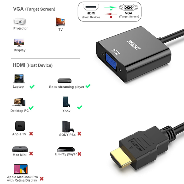 BENFEI HDMI Male To VGA Female Adapter With Gold-Plated Connector And Supports Resolution Up To 1080P@60Hz - Black Colour