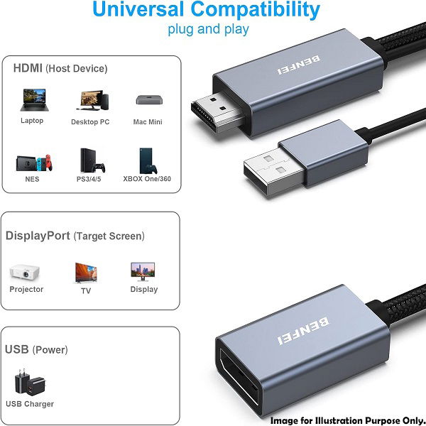 BENFEI HDMI Male To DisplayPort Female Adapter With USB-A Power Port Male And Supports Resolution Up To 4K@60Hz, Simultaneously Sync Video And Audio And Solid Nickle-Plated Connectors - Grey Colour