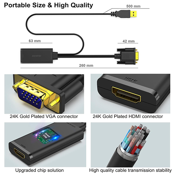 BENFEI VGA Male To HDMI Female Adapter + USB-A Male Audio With Gold-Plated Connectors And Support Resolution Up To 1080P@60Hz - Black Colour