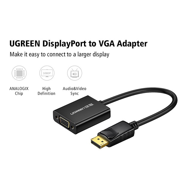UGreen 20415 DisplayPort Male To VGA Female W/O Audio Adapter With Gold-Plated Connectors And Supports resolution Up To 1080P@60Hz - Black Colour