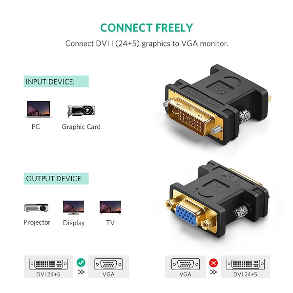 UGreen 20122 DVI-I (24+5) Male To VGA Female Adapter With Gold-Plated Connectors And Supports Resolution Up To 1080P@60Hz - Black Colour