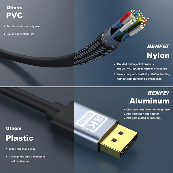 BENFEI DisplayPort V1.4 Male To Male 8K@60Hz Nylon Braided 1.8m Cable With Premium Aluminium Alloy Casing And Gold-Plated Connectors
