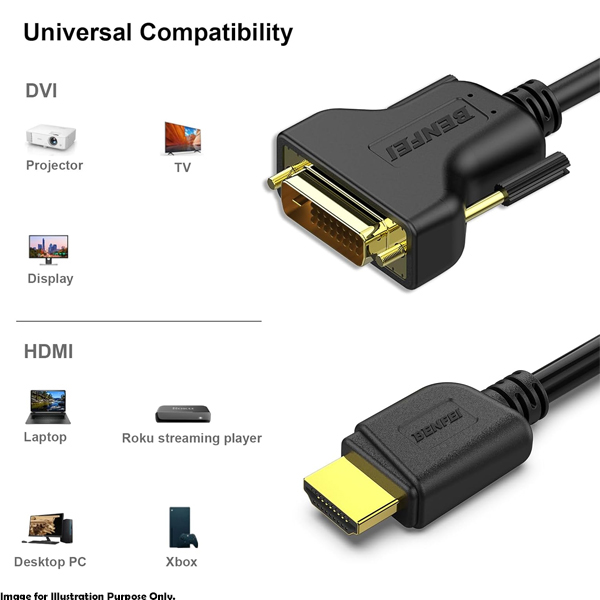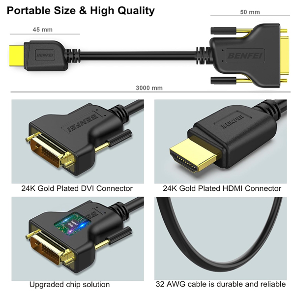 BENFEI HDMI Male To DVI-D (24+1) Male 3m Bi-Directional Cable with Gold-Plated Connectors and Supports Resolution Up To 1080P@60Hz - Black Colour
