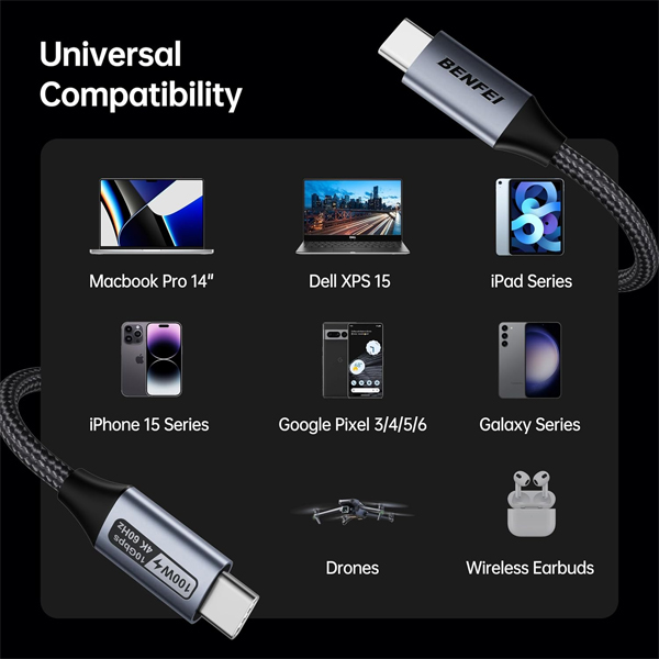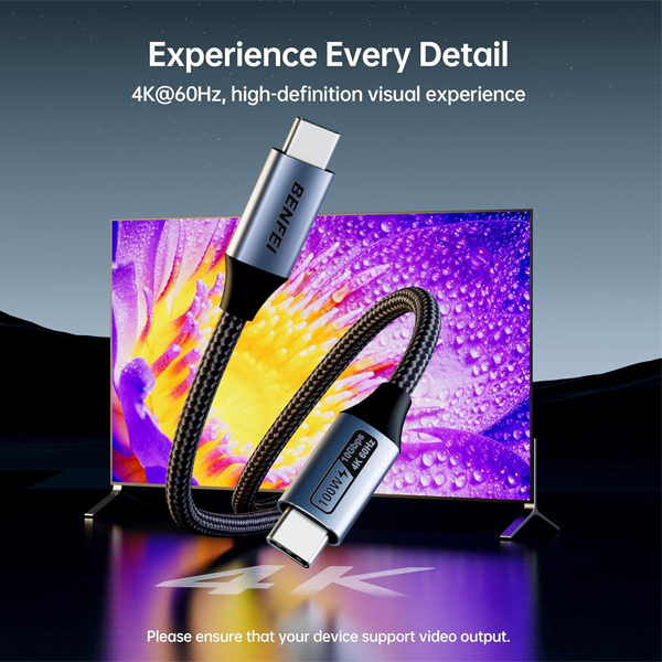BENFEI USB-C 3.2 Gen 2 Male To Male 5A QC/PD3.0 100W(Max.) 1m Cable With Nickle-Plated Connectors And Supporting Fast Data Transfer Speed Up To 10Gbps- Grey Colour