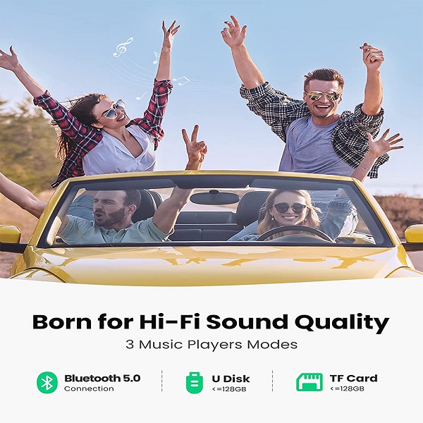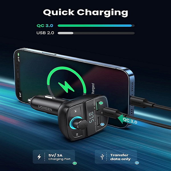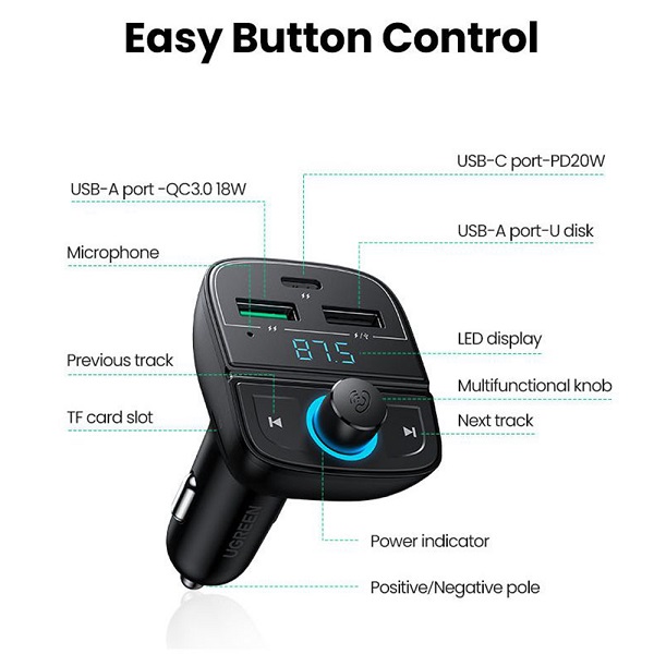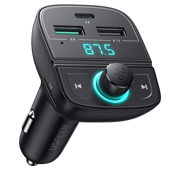 UGreen 80910 Bluetooth 5.0 Car Modulator With Dual USB-A And 1X USB-C Port And TF Card Slot And Built-In Microphone - Black Colour