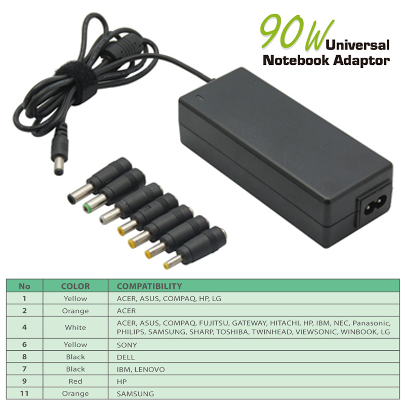 8 Different DC Tips included (A-H): Acer, Dell, Gateway, HP/Compaq, IBM/Lenovo, Samsung, Sharp, Sony, Toshiba