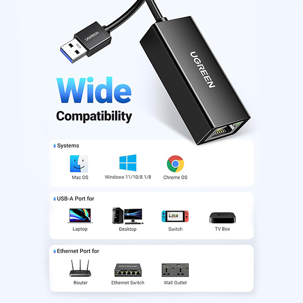 UGreen 20256 USB-A 3.0 Male To RJ45 Gigabit Ethernet Female Adapter With Nickle-Plated Connectors And Supports Network Speed Up To 1000Mbps - Black Colour