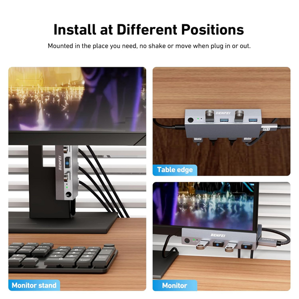 -Mounted on different positions: Monitor stand, Table edge, Monitor