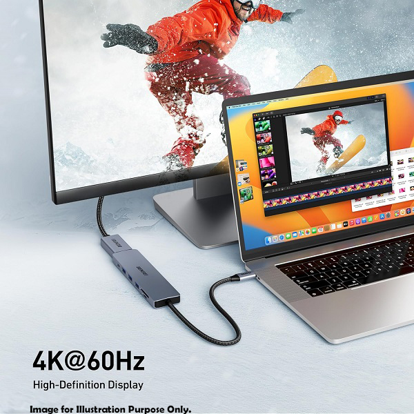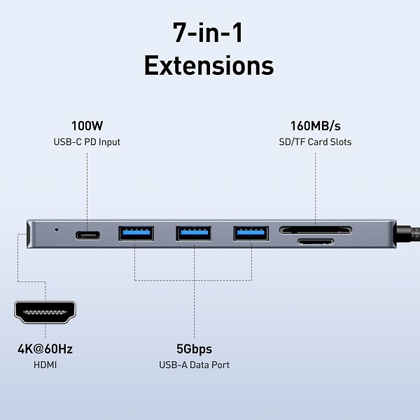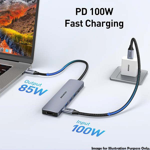 BENFEI USB-C 7-In-1 Docking Station With 3X USB3.0, 1X HDMI 4K@60Hz, 1X SD/TF Card Slot And USB-C PowerDelivery 100W (Max) - Grey Colour