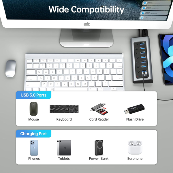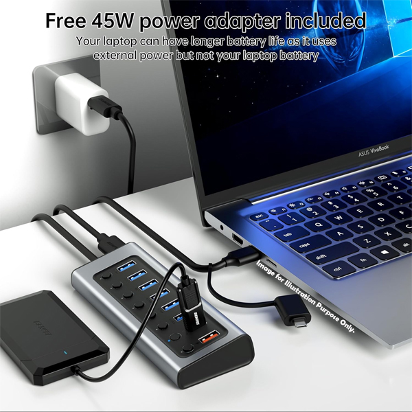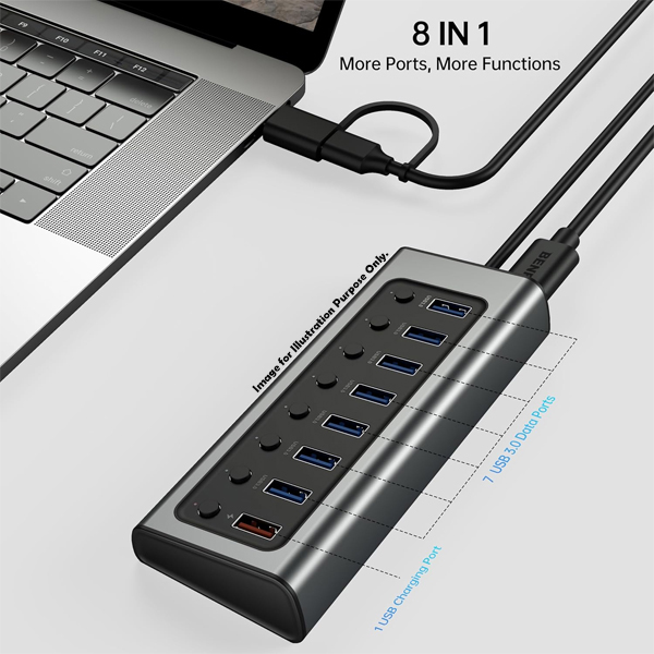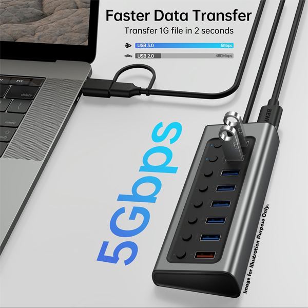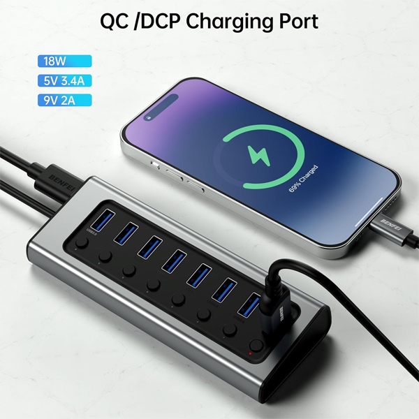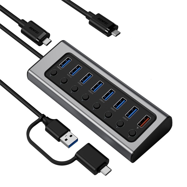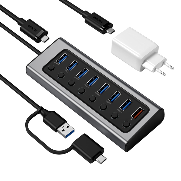 BENFEI USB-A 3.0 7-Port Data Sync Powered Hub Built with Non-Detachable USB-C-to-USB-A 3.0 Cable, 1X USB-A BC 1.2 Charging Port And Included 45W PD GaN Charger – Grey Colour