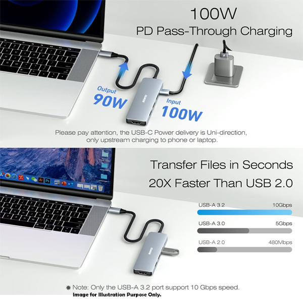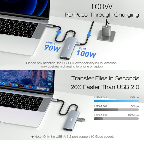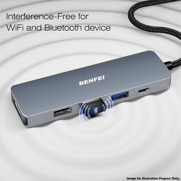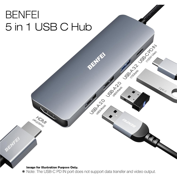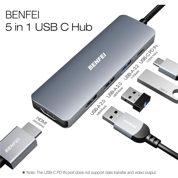 BENFEI USB-C 5-In-1 Compact Docking Station With 1X HDMI 4K@30Hz, 1X USB-A 3.2 10Gbps, 2X USB2.0 480Mbps And USB-C 100W (Max) PowerDelivery - Grey Colour