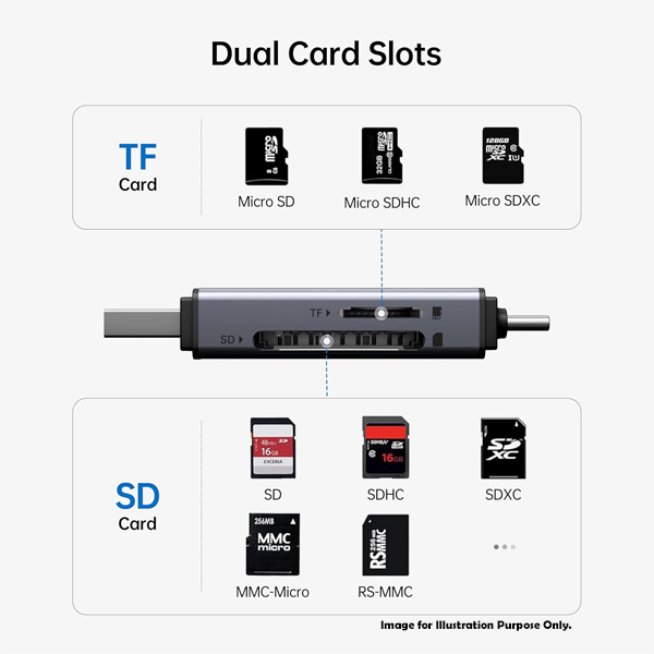 -Supports: SD, SDHC, SDXC, RS-MMC, MMC, Micro SD, Micro SDHC, Micro SDXC and UHS-I cards in large capacity up to 512G