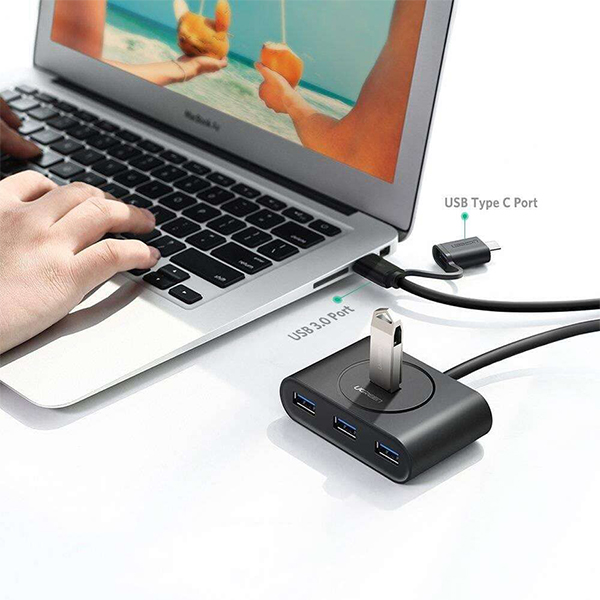 UGreen 40850 USB-A 3.0 Female 4Port Hub With USB-C Male OTG Adapter, Nickle-Plated Connectors And Supports Data Transfer Rate Up To 5Gbps - Black Colour
