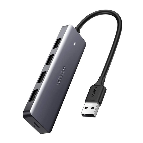 UGreen 50985 USB-A 3.0 Male To 4 Port USB-A 3.0 With Optional USB-C Power Port For Extra Power Support And Support Data Transmission Up To 5Gbps - Grey Colour