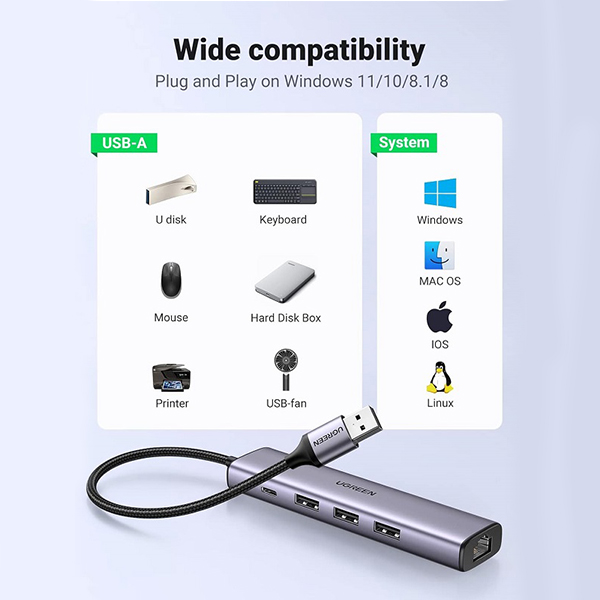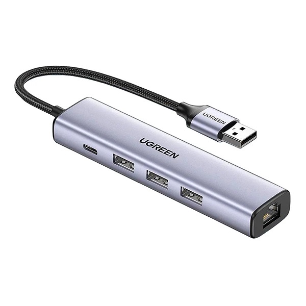 UGreen 60554 USB-A 3.0 Male To USB3.0 3Port Hub And Gigabit Ethernet Port With Stable Data Transfer Up To 5Gbps And With Optional USB-C Power Support - Grey Colour