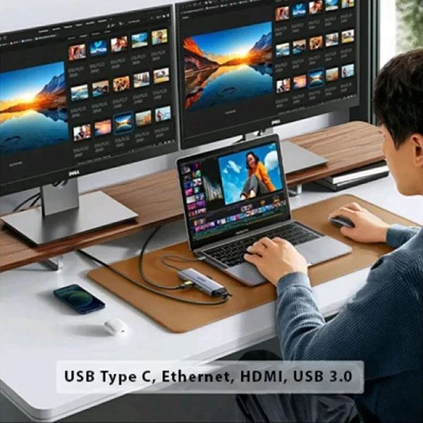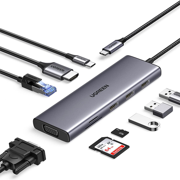 UGreen 15600 USB-C 9-In-1 Docking Station With 3X USB3.0, HDMI 4K@30Hz, VGA 1080P@60Hz, GLAN, SD/TF Card Slot And USB-C 100W (Max) Power Delivery - Metallic Grey Color