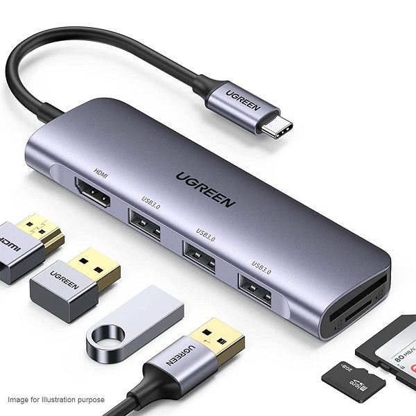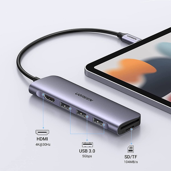 UGreen 70410 USB-C 6-In-1 Docking Station With HDMI 4K@30Hz And 3x USB3.0 5Gbps Transfer Speed And Built-In SD/TF Card Slot - Space Gray Colour