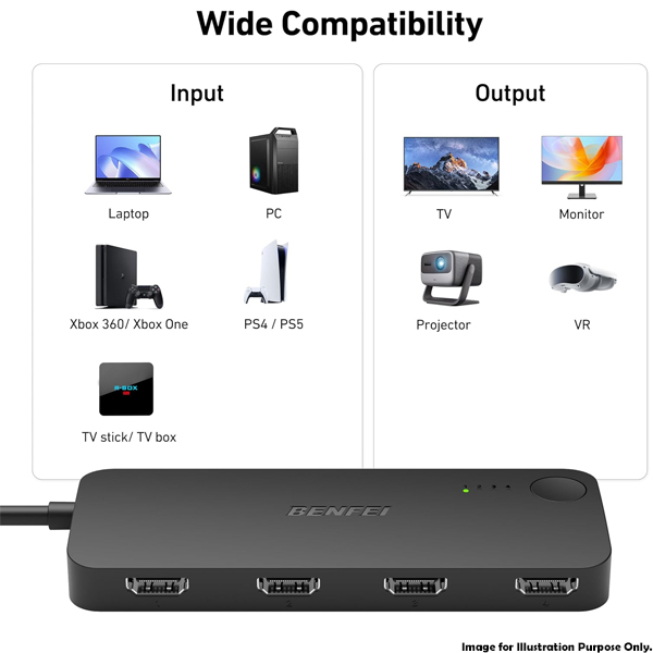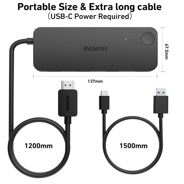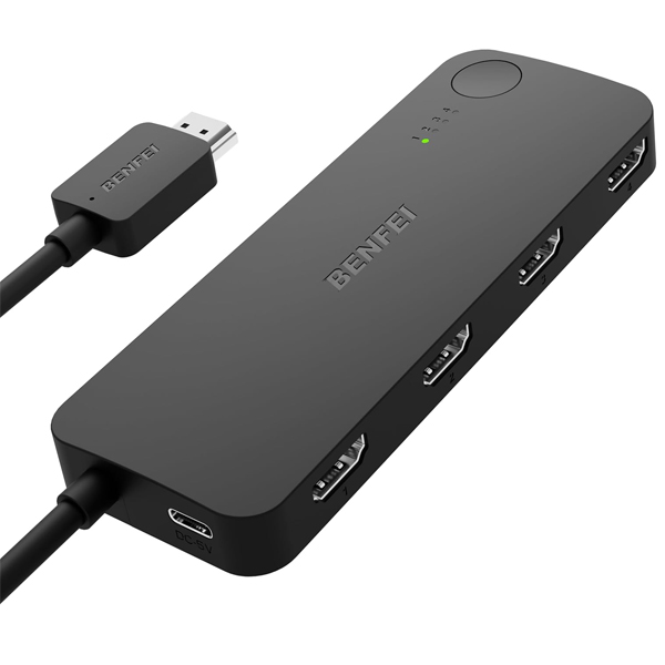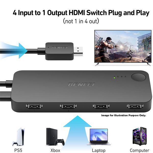 BENFEI HDMI V2.0 4-In To 1-Out 4K@60Hz Amplified Switch With 1X USB-C Port for Additional Power (USB-C Cable Included Only) And 3D/ HDR/ Audio and Video Sync Supported - Black Colour