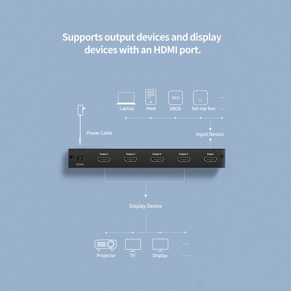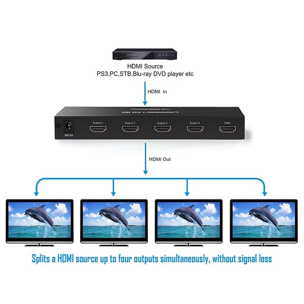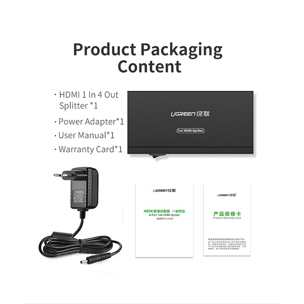 UGreen 40202 HDMI 1-In 4-Out 4Port Amplied HDMI Splitter With Audio Supporting HD Resolution And 3D Video Up To 4KX2K@30Hz - Black Colour
