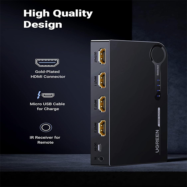 UGreen 40234 HDMI 3-In 1-Out 3Port Amplified Switch With Infrared Remote And Support Resolution Up To 4K@30Hz - Black Colour