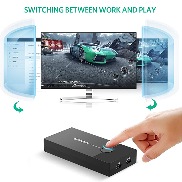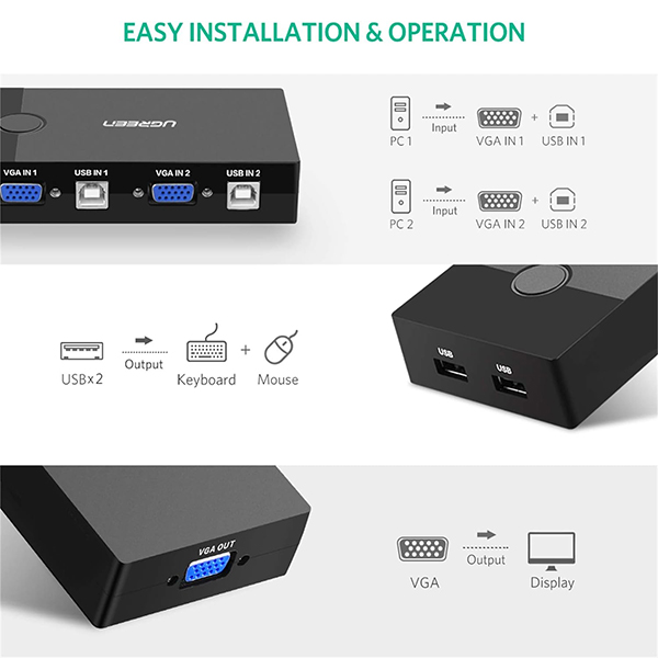 UGreen 30357 2-In 1-Out USB VGA KVM Switch Supports High-Definition 1080P@60Hz Resolution And Seamless Switch Between 2 PCs - Black Colour